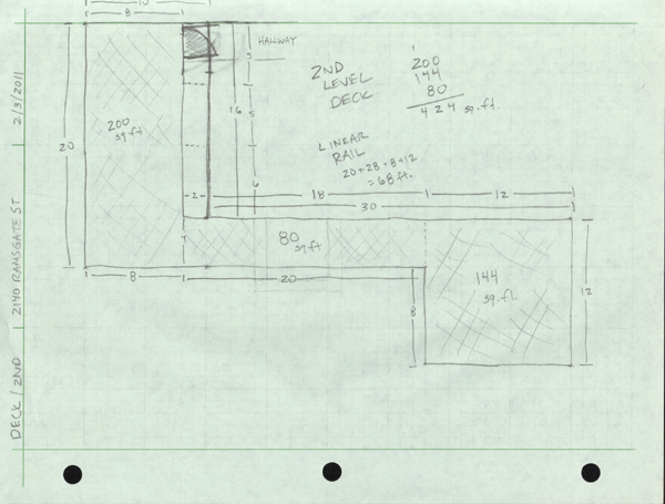 The concept is to utilize the space we have on the backside of the house and add 424 sq. feet of deck that would only be accessable from inside the house. This means that we’d add a door at the end of our hallway on the second level to access the deck. It would wrap around the east side of the house and a small walkway would connect to a 12×12 deck that would sit directly above the current deck, on the north side of the house.