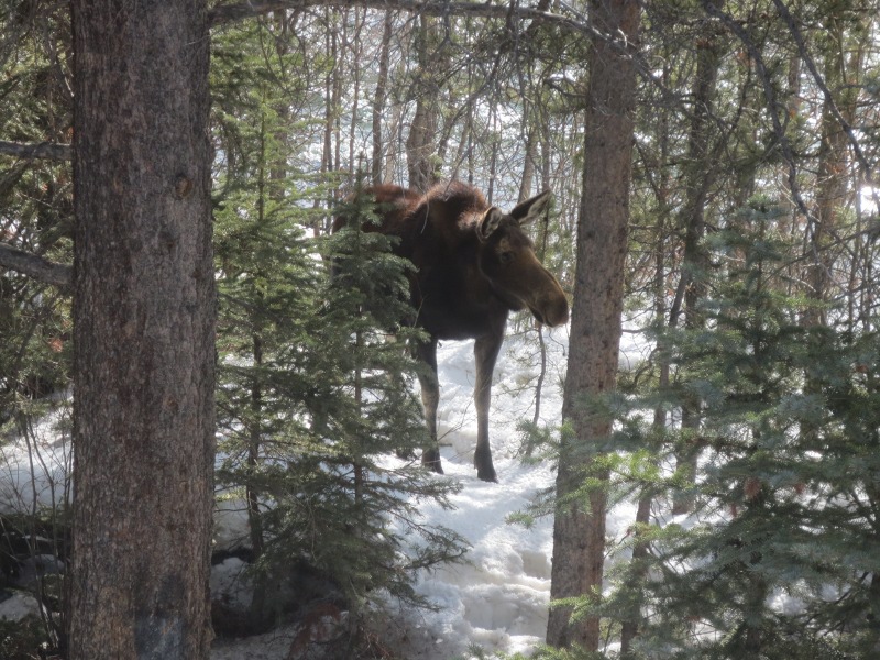 We were exhausted! After snowboarding all day, we went back to Silverthorne and relaxed. After checking out a few stores, we took a break along Willow Creek. The area has a bike path along the creek and we happened to stumble upon a moose. It was just chilling there along the creek. We can’t believe that we saw a moose, in the middle of Silverthorne.