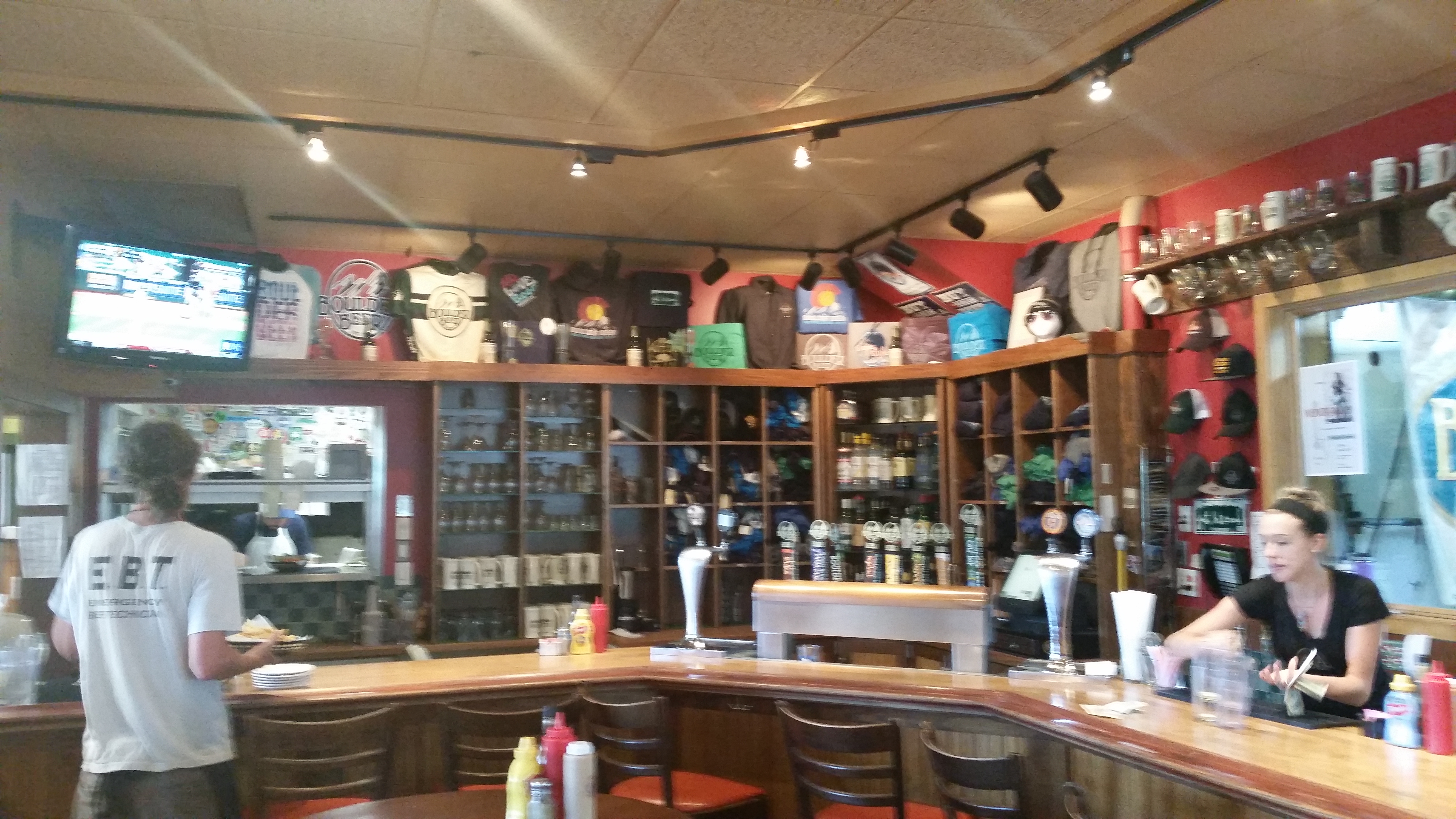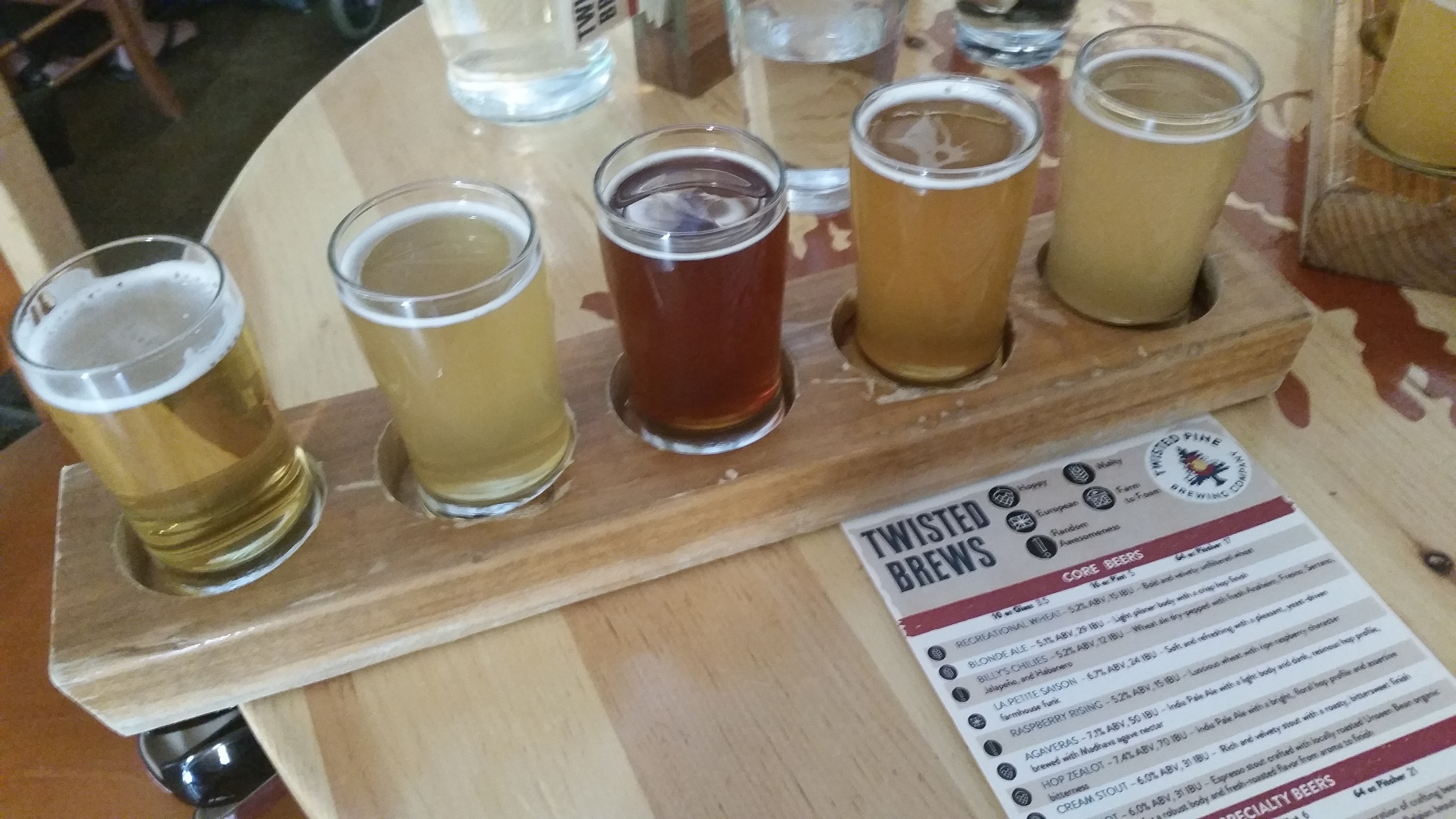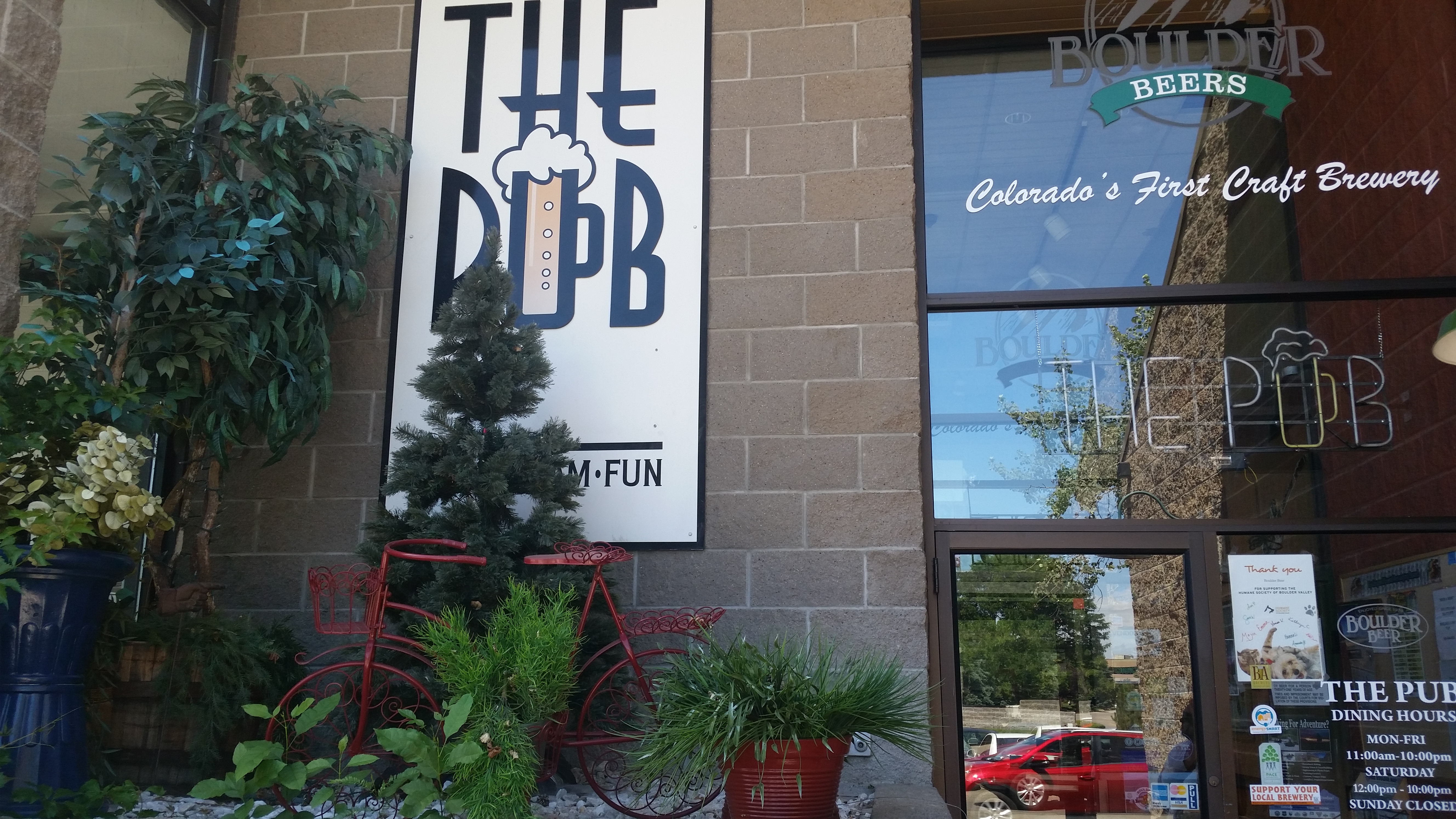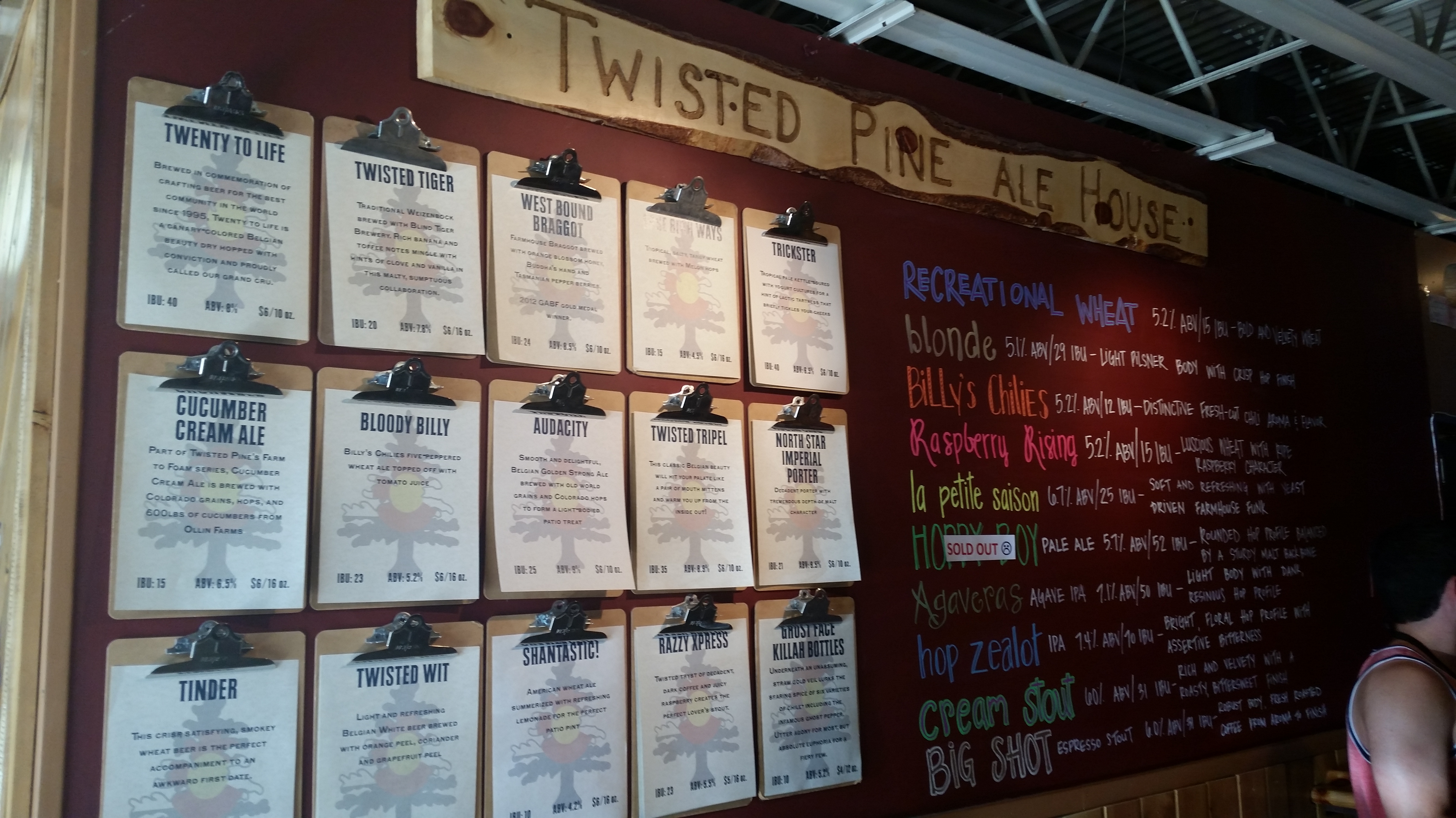 We made an audible and headed back into Boulder. Some quick research for somewhere open for lunch lead us to Twisted Pine Brewing. Really cool pub scene, neat logo, and good beers. Lunch was fantastic. I got a Greek salad and a Mexican-style pizza. MB had a chicken wrap. We each selected five beers to try and sampled each others flight. Content with lunch and our first tasting of the day, we headed to our next stop.