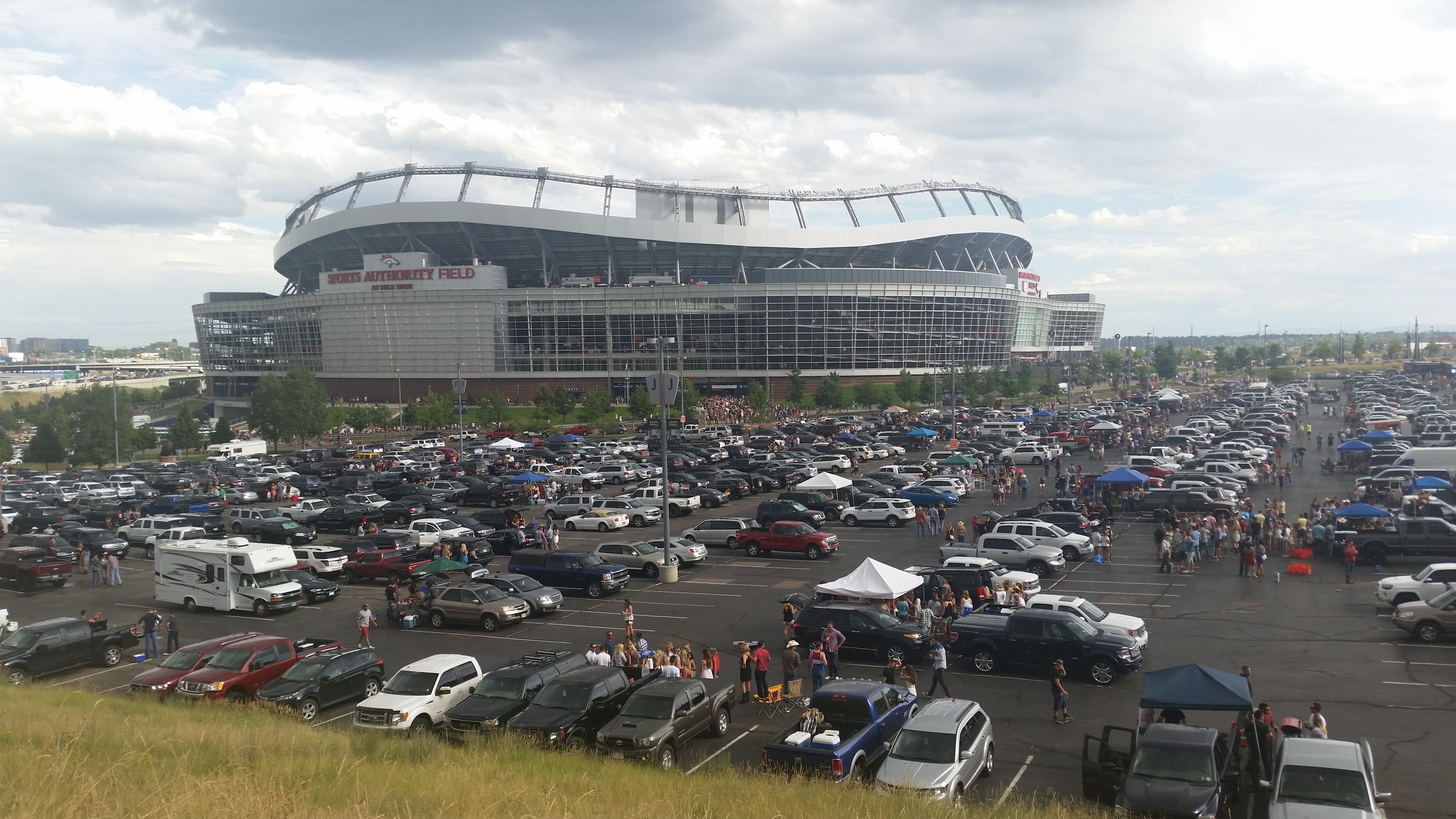 The shuttle was full of people heading to the Jason Aldean & Kenny Chesney concert. We were dropped off near the stadium and then started walking around to check out the tailgating scene and try to sell an extra ticket that we had. After doing two laps around Mile High we had no luck in dumping the ticket. But there was some amazing people watching going down.