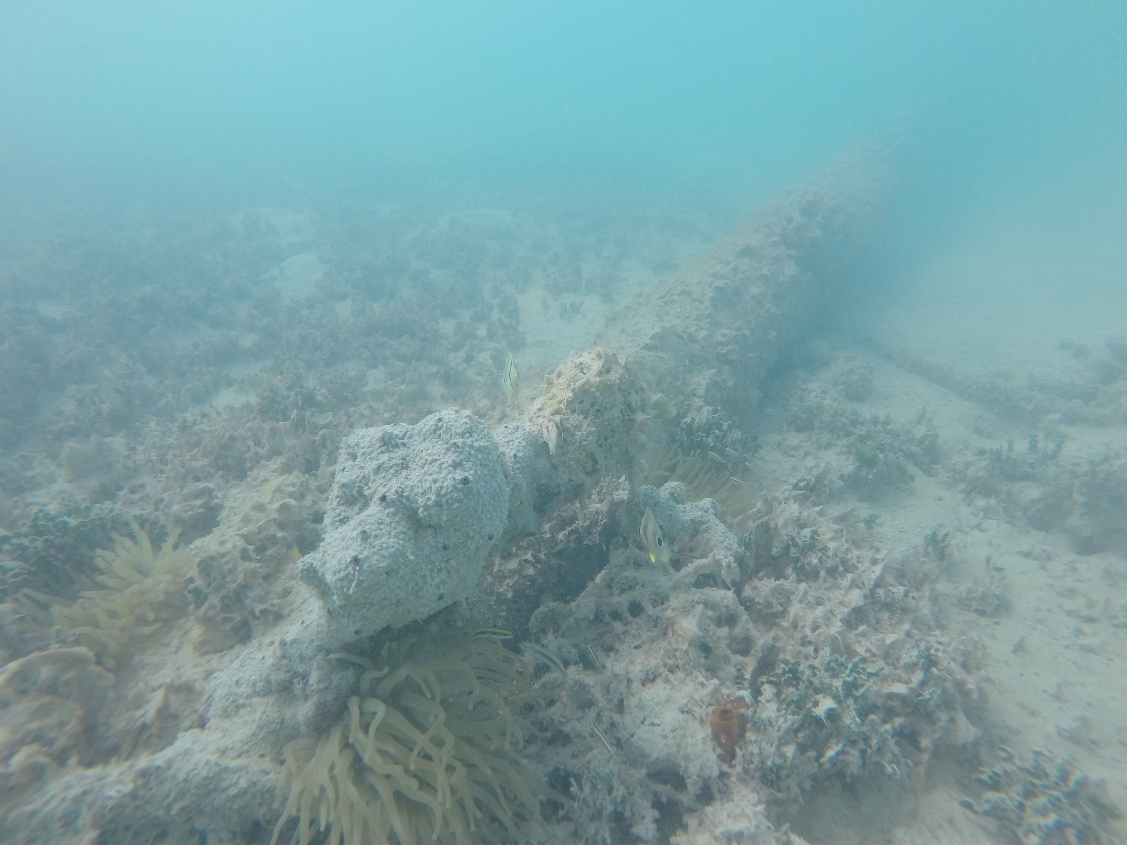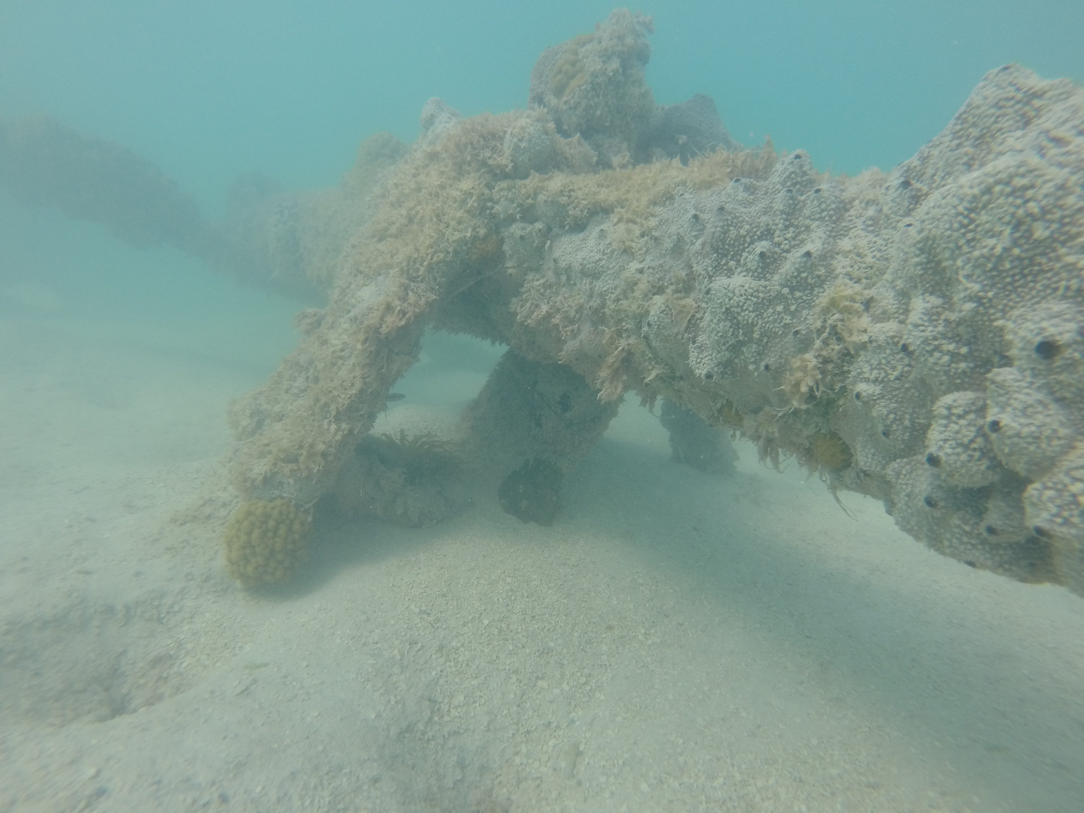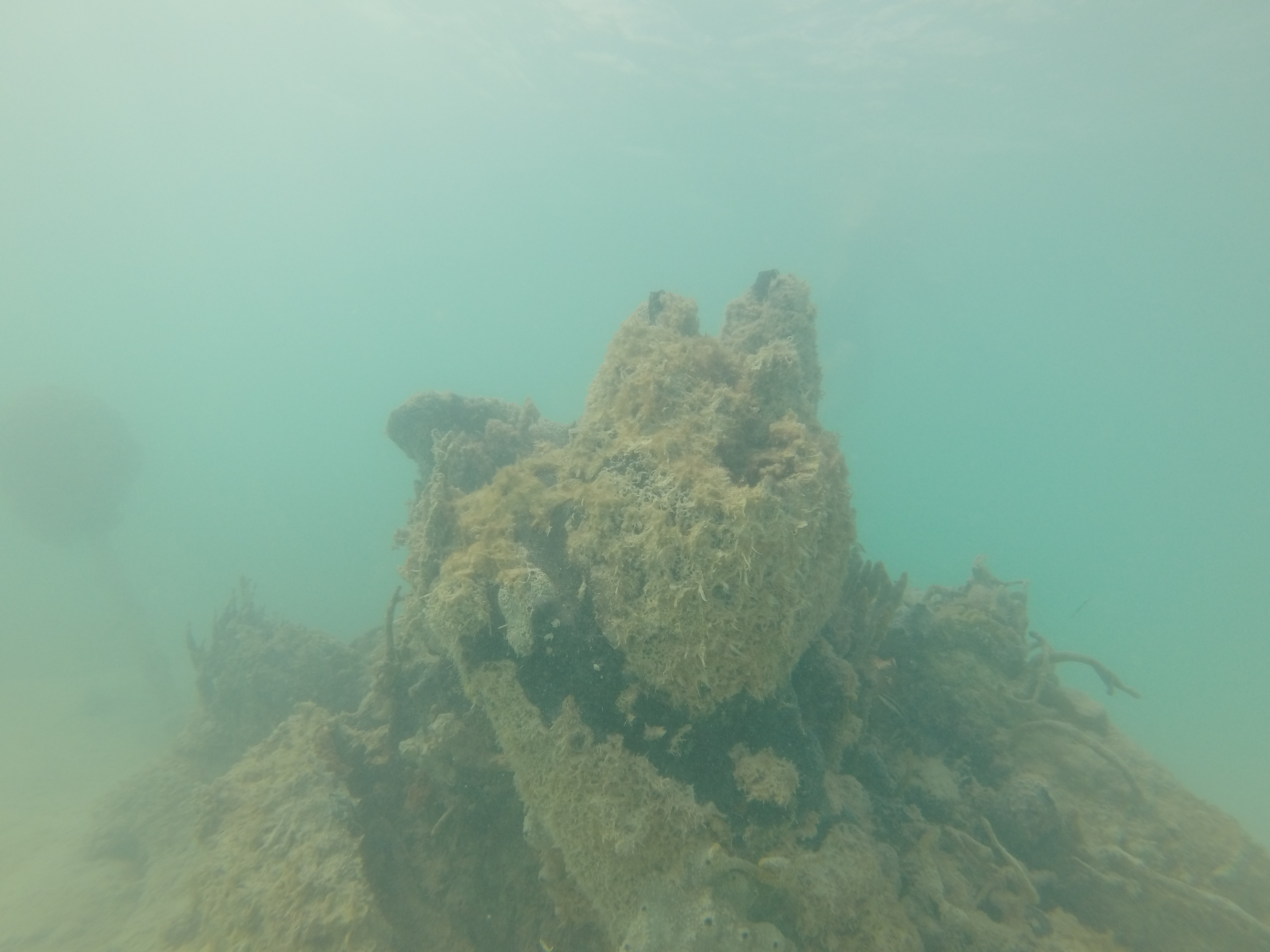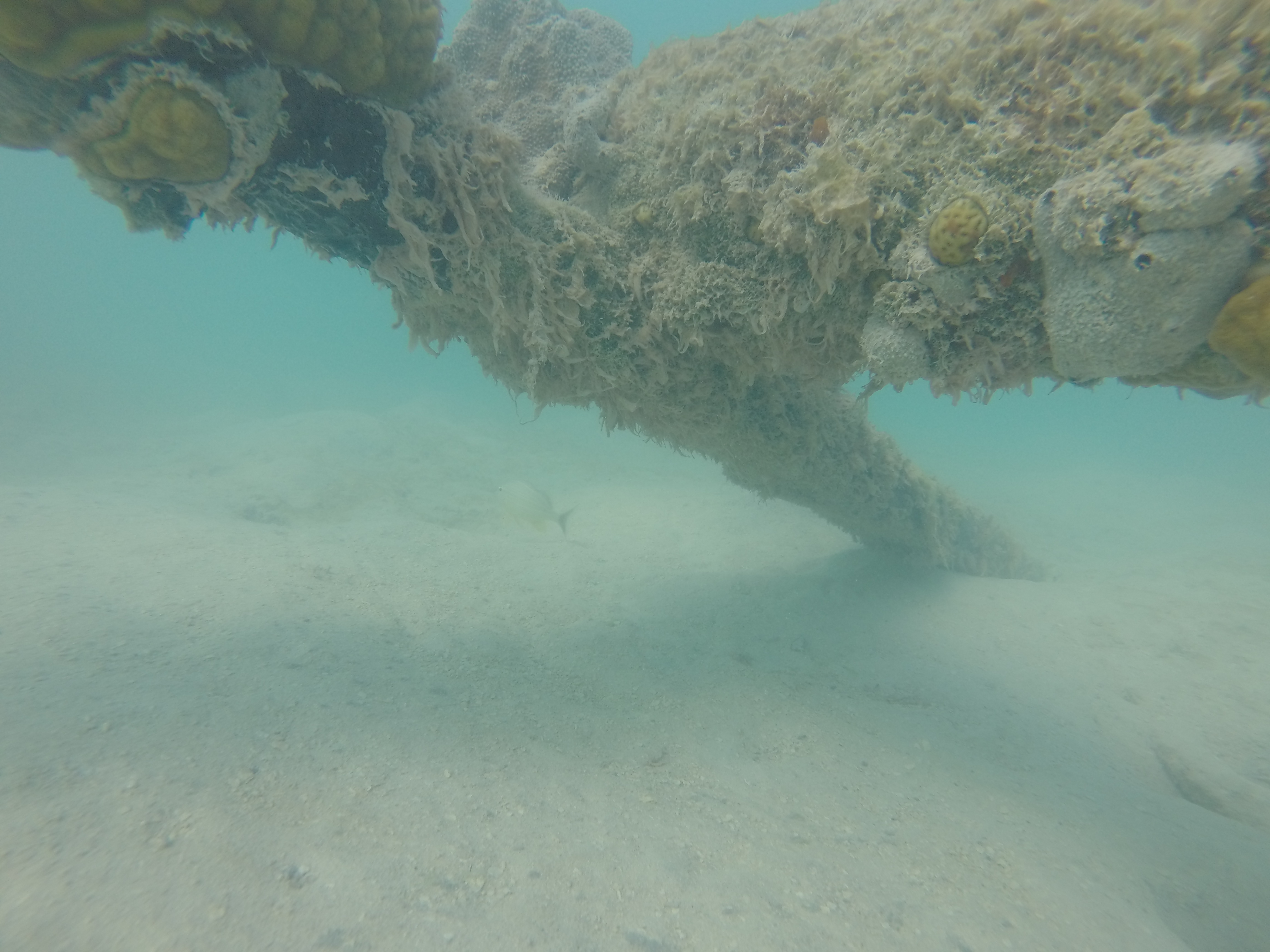 The water was calm, the bay was shallow, and our day just got a little better. Zander and I grabbed our snorkel gear and headed out. We randomly came across a sunken boat on the outskirts of the bay. We were way out there. I was heading towards a dive buoy and we totally scored.