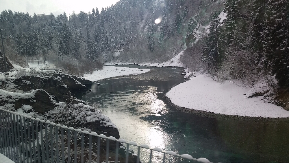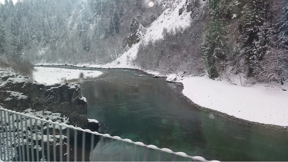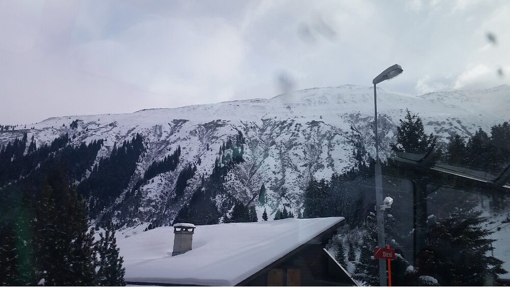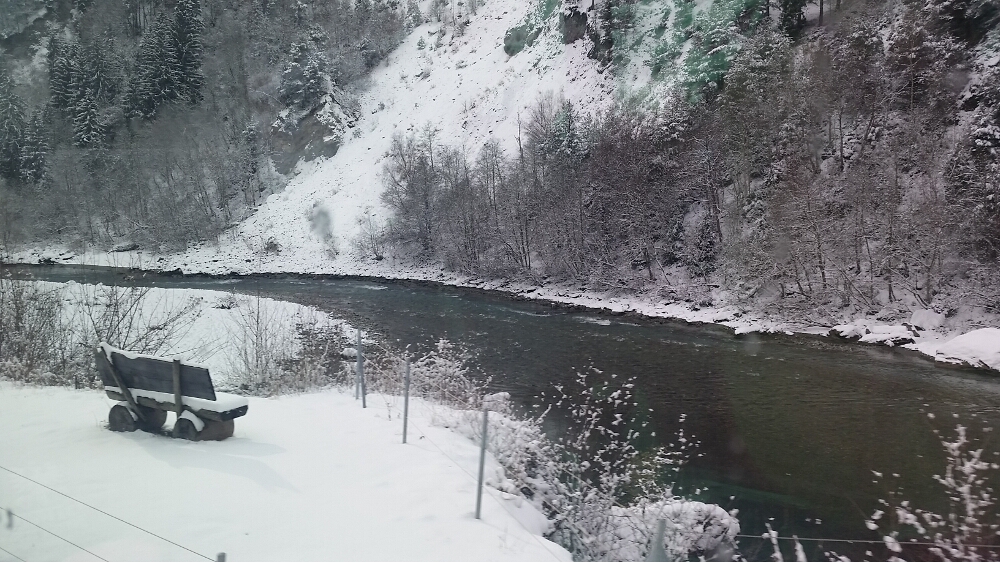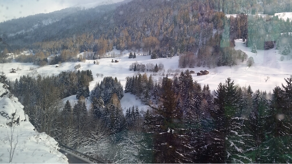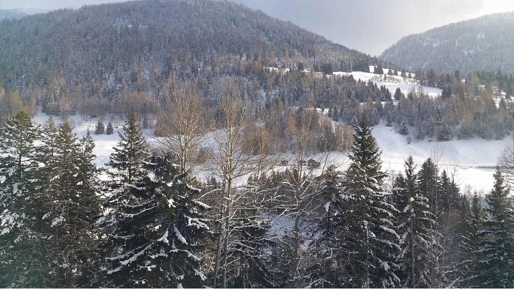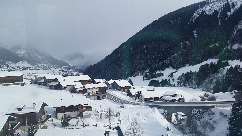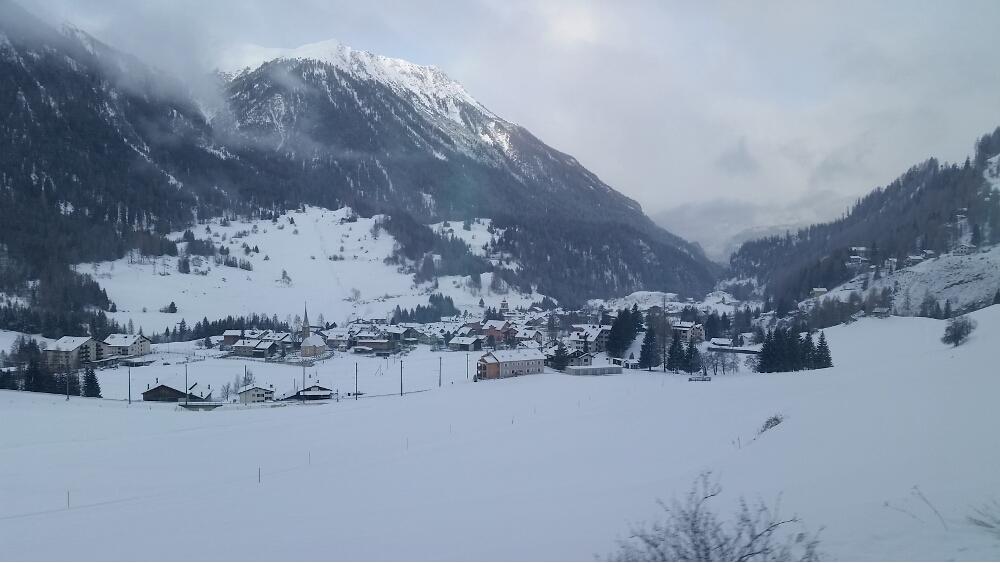 20160116_030556Finally, we arrived at the train station and settled into our seats. The train was warm and the panoramic windows were huge. We left precisely at 8:57 am. These trains are on Swiss time. The first part of our journey saw the sunrise over the mountains and a lake, then we traveled through the Preda-Bergün area, famous for 30-minute sledding trails—sledders would take the train from Bergün up to Preda, and sled down the mountain trail. Maybe next time!