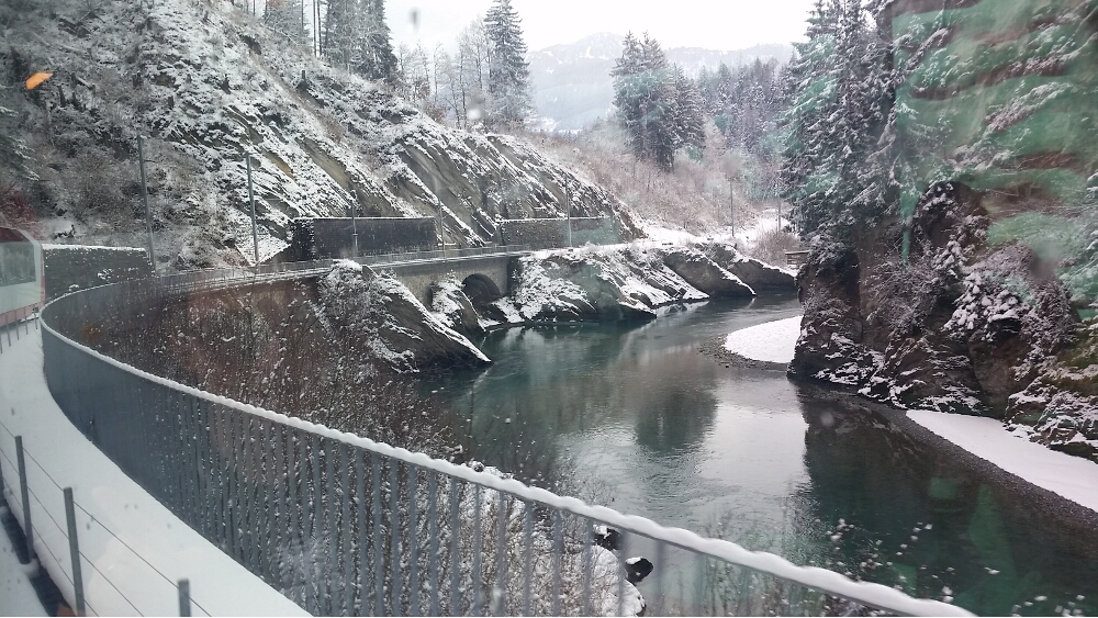The Glacier Express had a major stop/layover in Chur, where we had a 10-15 minute break. I took that as an opportunity to get off the train and stretch. It was cold out, but refreshing. The next stretch of the train ride took us through Rheinschluct, Disentis, Oberalppass, and Andermatt, while offering spectacular views of the Rhein River.