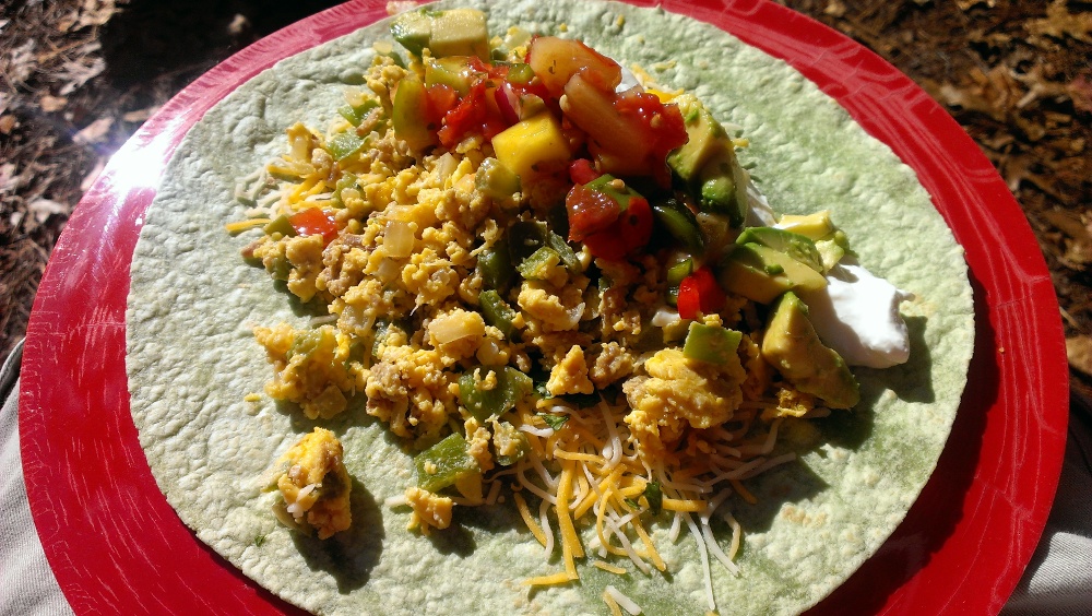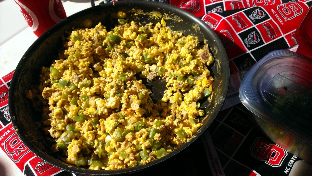It was a beautiful fall Saturday with a chilly morning and a 12:30 kickoff time. Michaela and David Huff joined us for the game. Jim also joined the family. The tailgate scene was off the chains with Carolina in town. There’s something about the tailgate that draws you in. The sights, the smells, the anticipation. Whatever that is, it was in the air at Carter Finley stadium this past weekend.We decided to go with brunch for the tailgate main course. The menu item of choice? Breakfast wraps. I sautéed some onions and peppers, then added in some turkey sausage. Scrambled eggs and cheese were the final touch to this tailgate masterpiece. And we had plenty of topping: salsa, sour cream, avocado, fresh cilantro, and hot sauce. Wrap all that up for a delicious brunch.