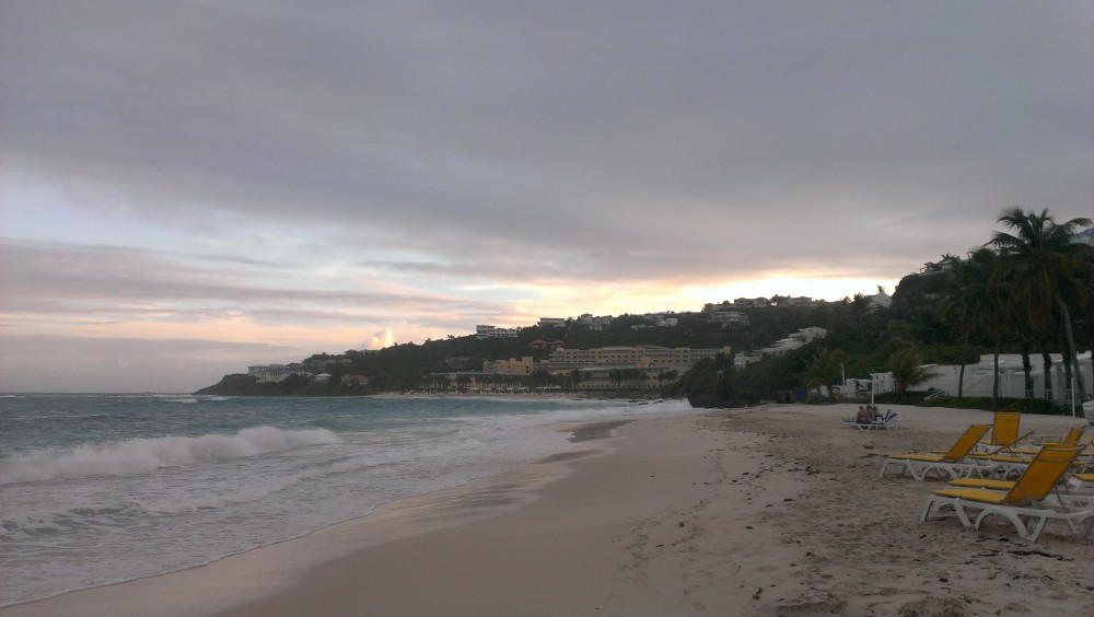 During the afternoon, we headed to Cul de Sac (French side) which wasn’t the kind of beach we were looking for because it was more of a harbor. Then it was off to Anse Marcel where we discovered the private beaches require you to buy food and/or pay for beach chairs. No thanks. We finally discovered the Grand Cayes beaches. It was a natural preservation area, a white sand beach filled with sea glass. We stayed for about an hour, swam, collected sea glass, and relaxed, before a storm off shore motivated us to move south to Orient Bay and beyond.