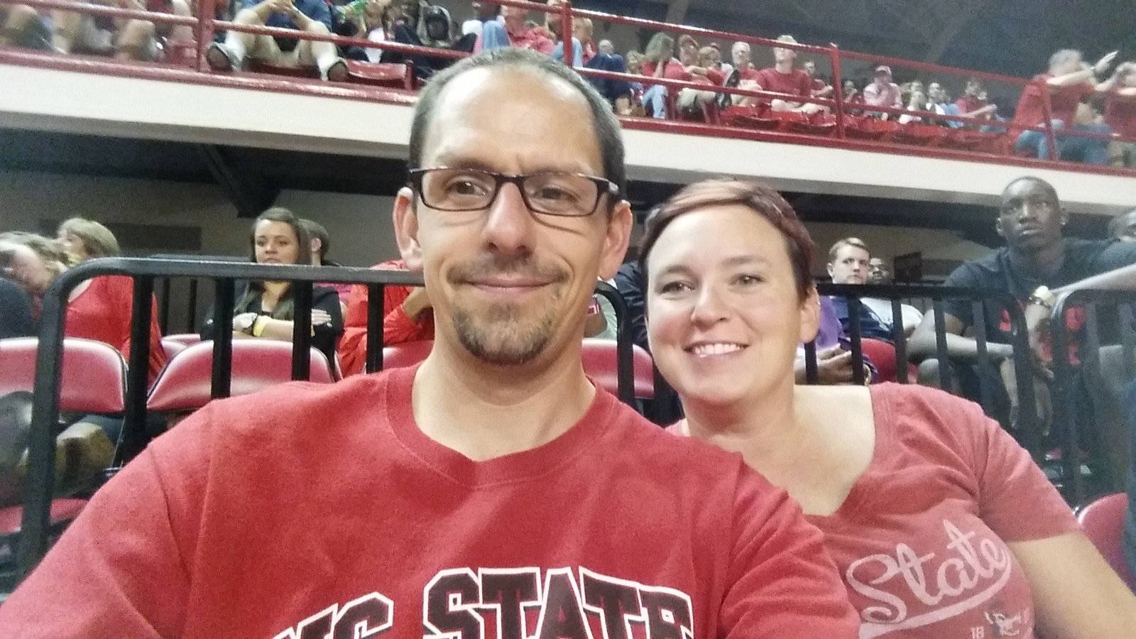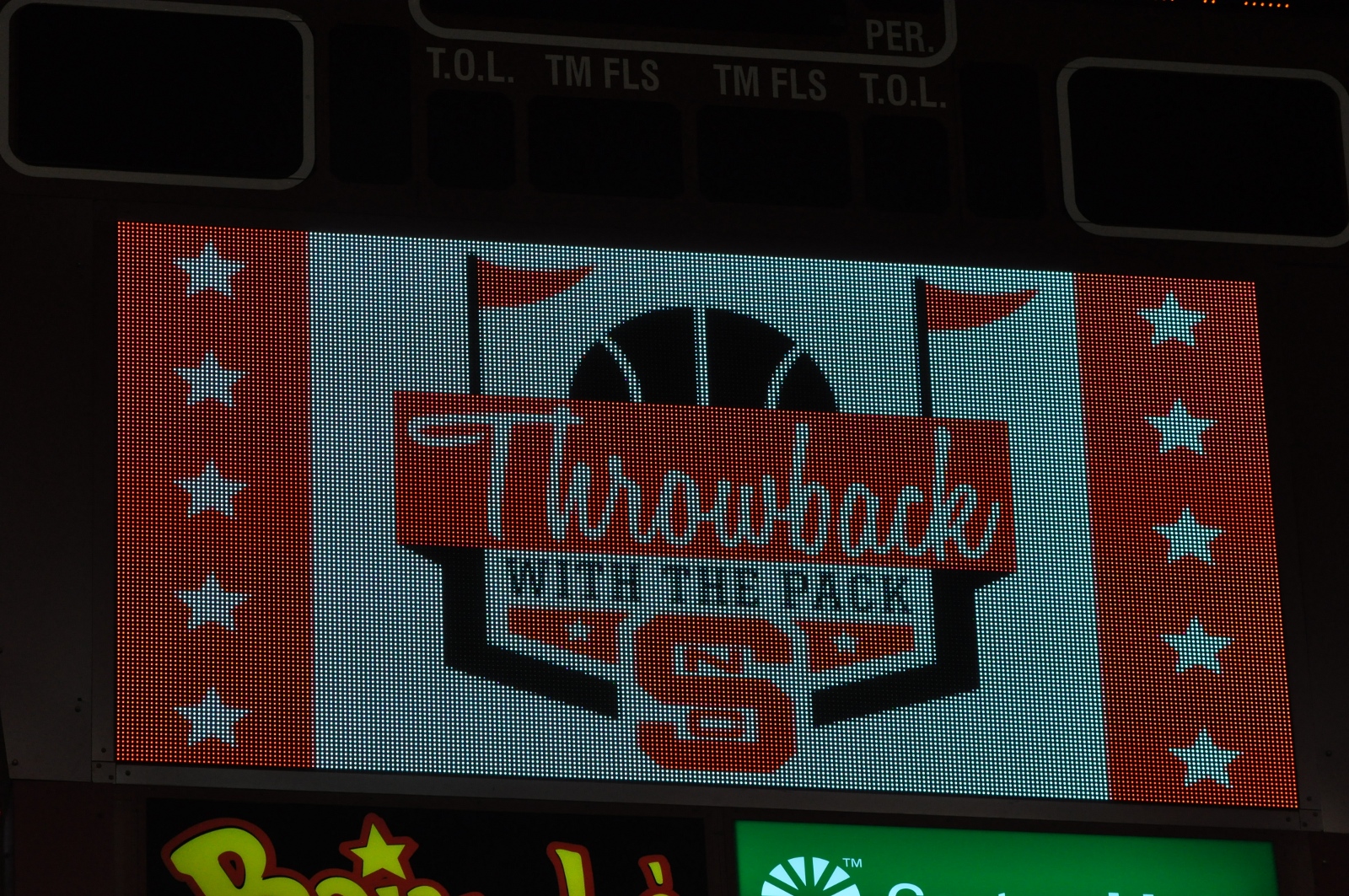 Merri Beth and I arrived at Reynolds Coliseum and got our courtside passes for the evening. We watched the end of the Wolfpack volleyball match and we were anxious for the NC State throwback game to begin. Unfortunately, MB had to hang back while I was a guest coach, but she was basically on the wing during the game.