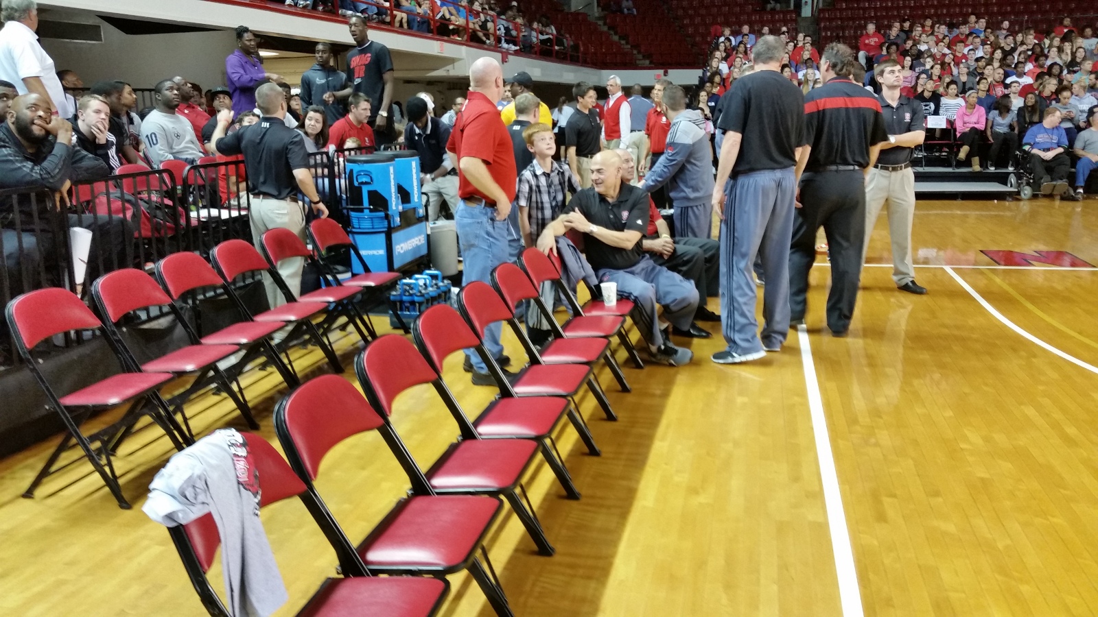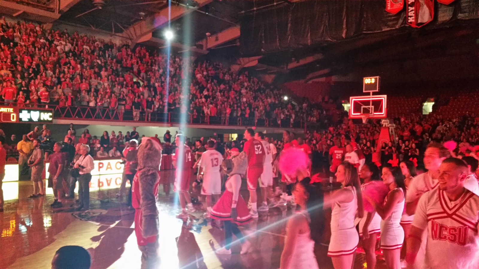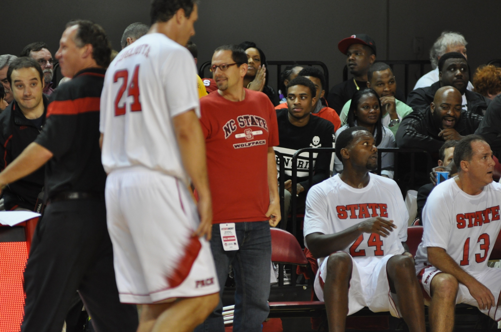 I took my seat on the bench with current Wolfpack coaching staff under Coach Mark Gottfried and Wolfpack legends warming up to play in the NC State Wolfpack throwback game. It was 15 minutes of red versus white, history coming to life for those of us who missed 1974 and 1983.
