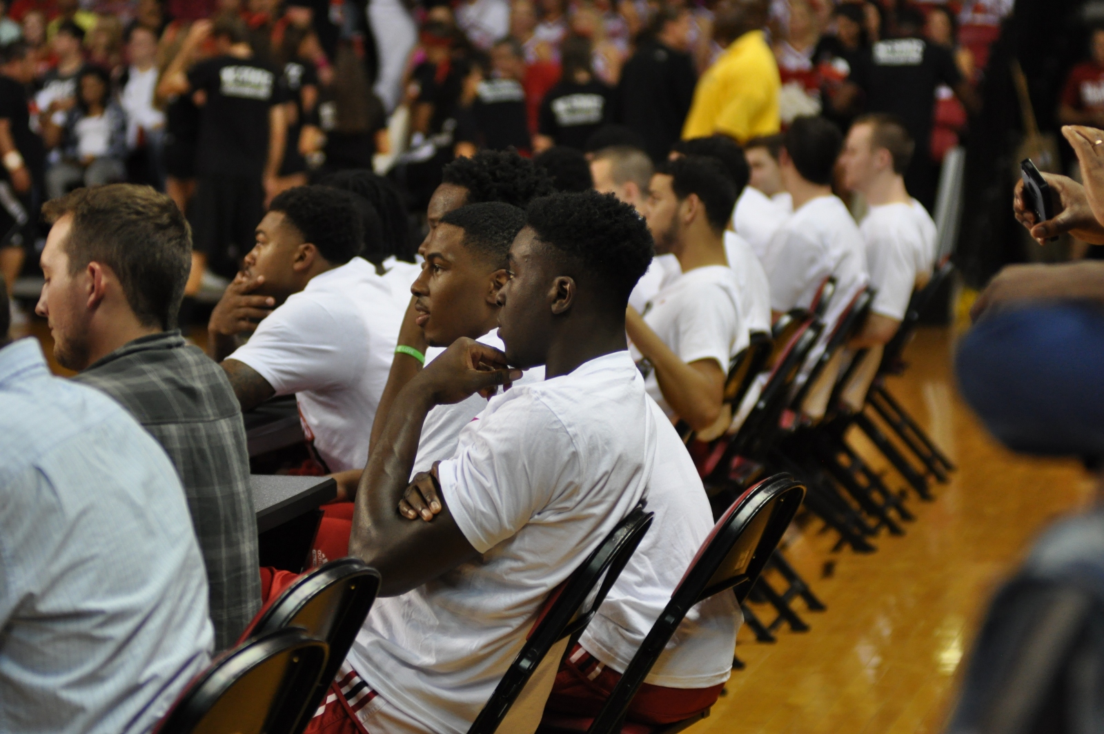 Merri Beth joined me after the alumni game to watch the midnight scrimmage for the 2014-15 men’s basketball team. We enjoyed our seats behind the bench as the game unfolded giving us and many other fans a preview to the upcoming basketball season. Adam and Joe added their commentary as necessary.