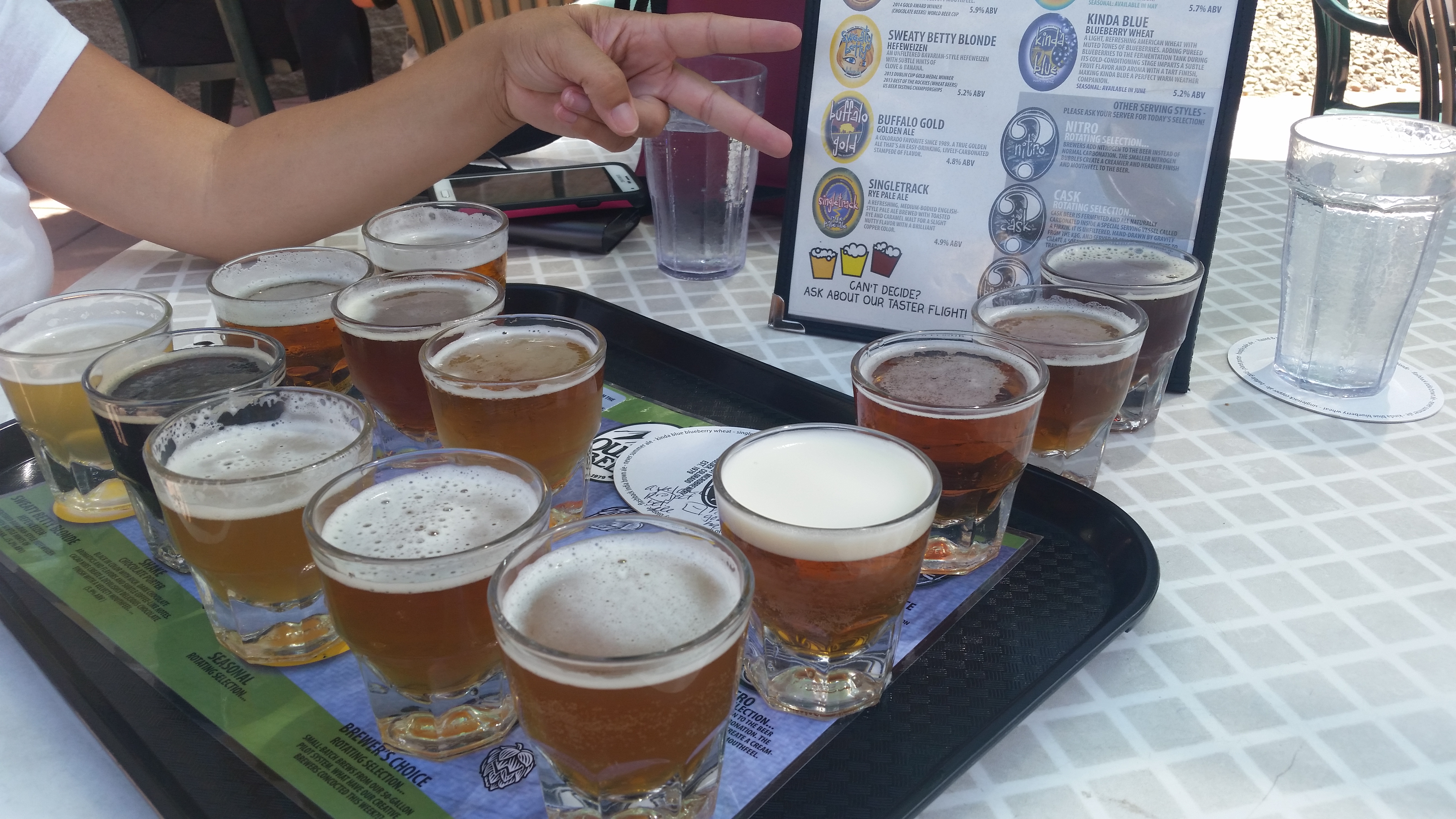 Nestled in their own roundabout in an industrial park-like setting, Boulder Beer boasts being the first craft brewery in Colorado starting in 1979. We got a table outside and ordered a flight to share. To our surprise, their flight has 13 samplers. Wow! That was a little more than we thought and agreed that it was OK to not finish all of them before we even started.
