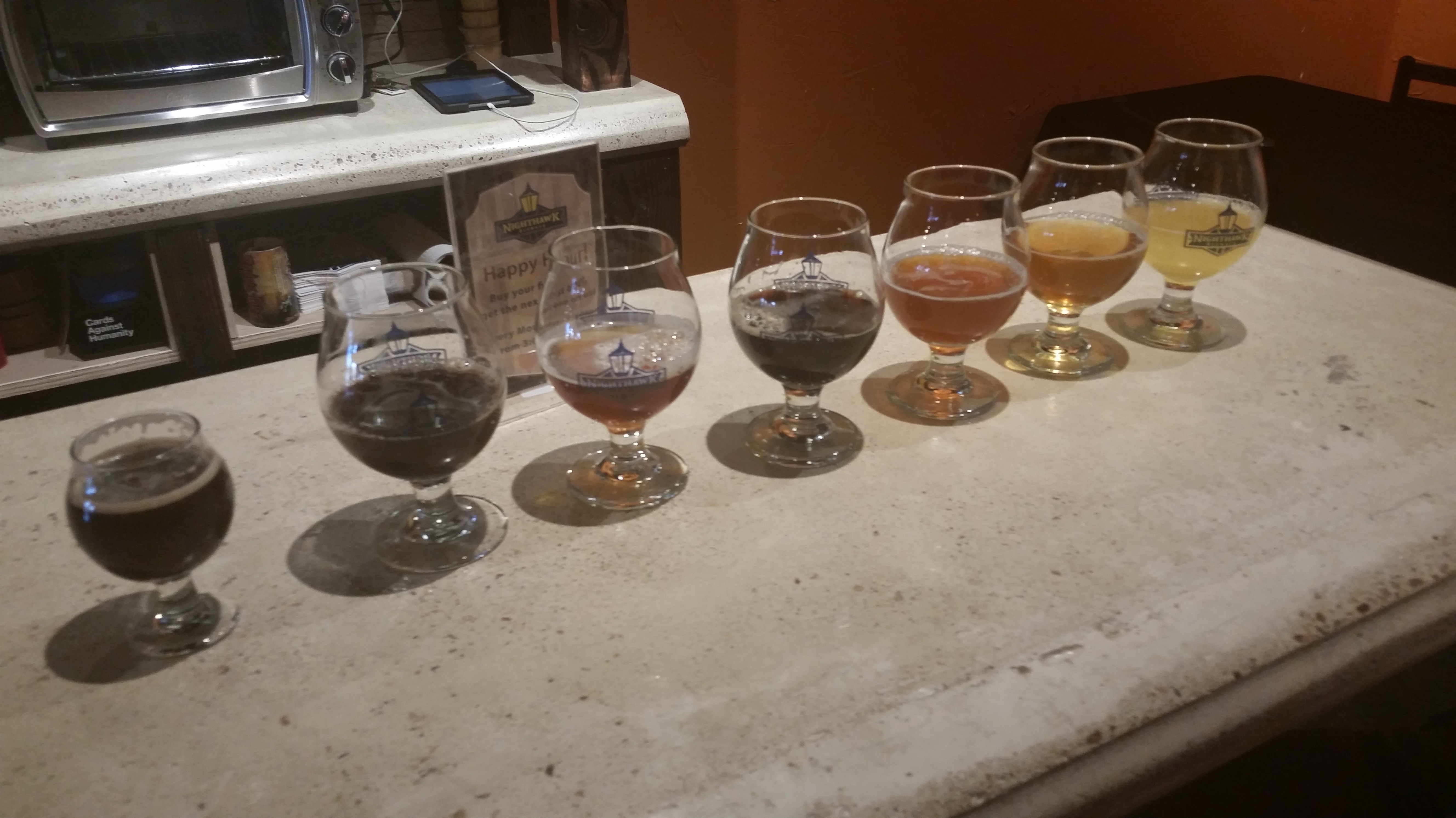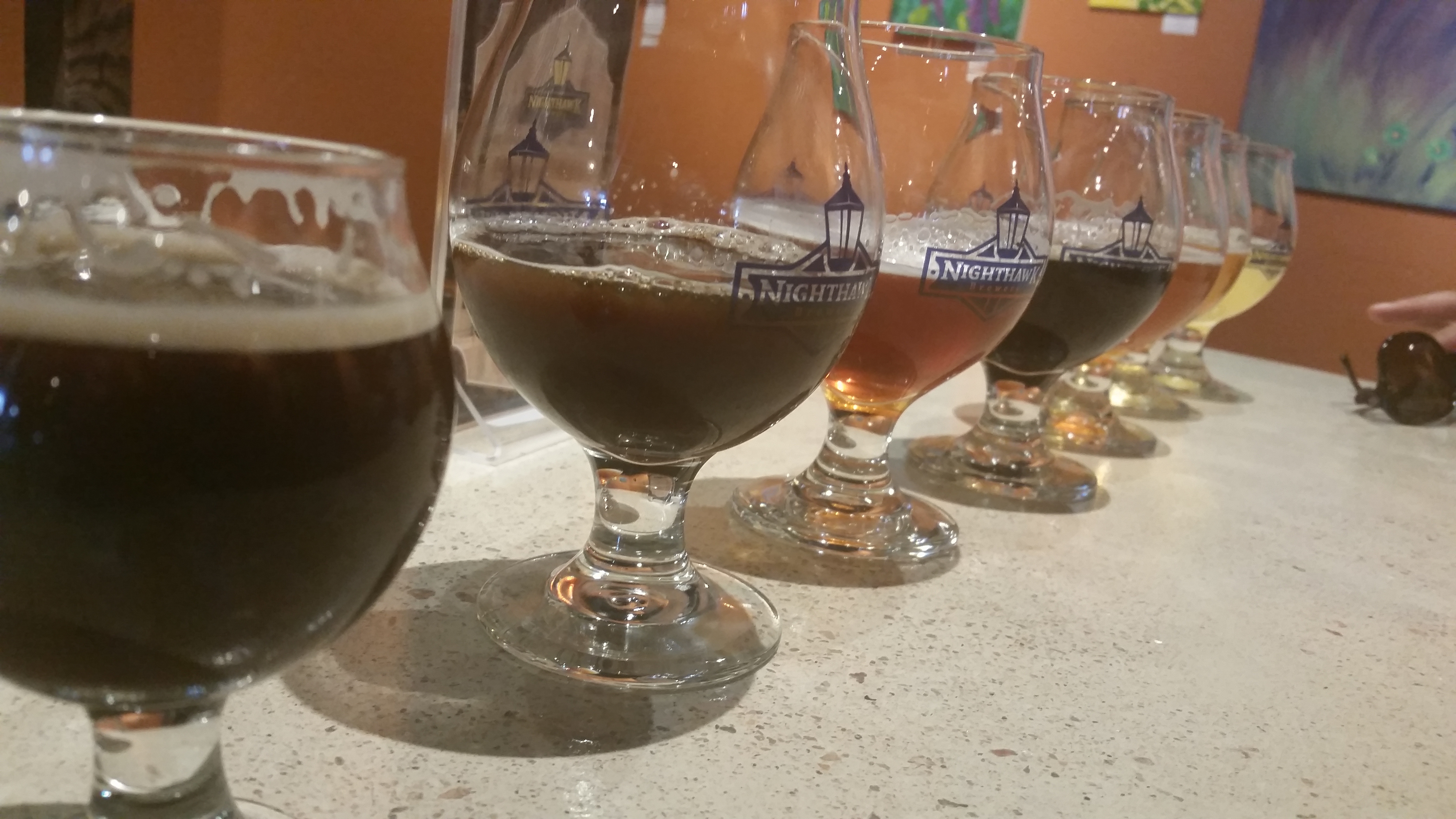 With time expiring before we needed to head back to Denver to go to the concert, we had time for one more brewery. I navigated us to Nighthawk Brewery, located just off the Denver-Boulder turnpike. MB and I found two seats at the bar and flew right into a full flight of beers. There were seven different styles to taste from and we shared the flight together. We found a few beers that we liked and only a few that didn’t please our palate.