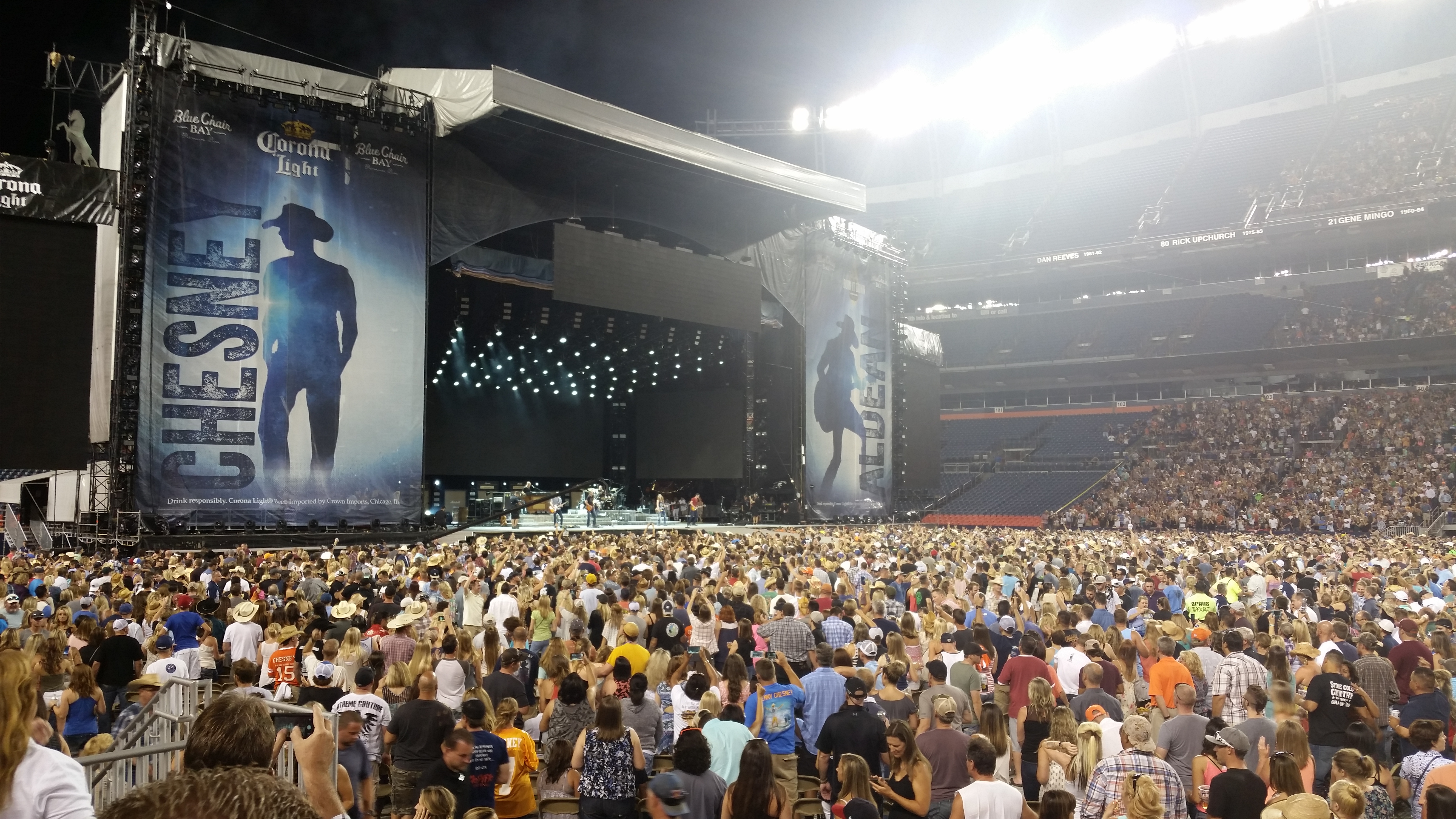 Another highlight included a Denver Broncos helmet giveaway to one lucky fan after Chesney played Boys of Fall—he’s a huge sports fan in case you didn’t know and even mentioned spending time at the Denver Broncos camp this morning. The girl who received the helmet was very emotional as Chesney brought her on stage. She was overcome with joy—it was a great feeling for the entire stadium.