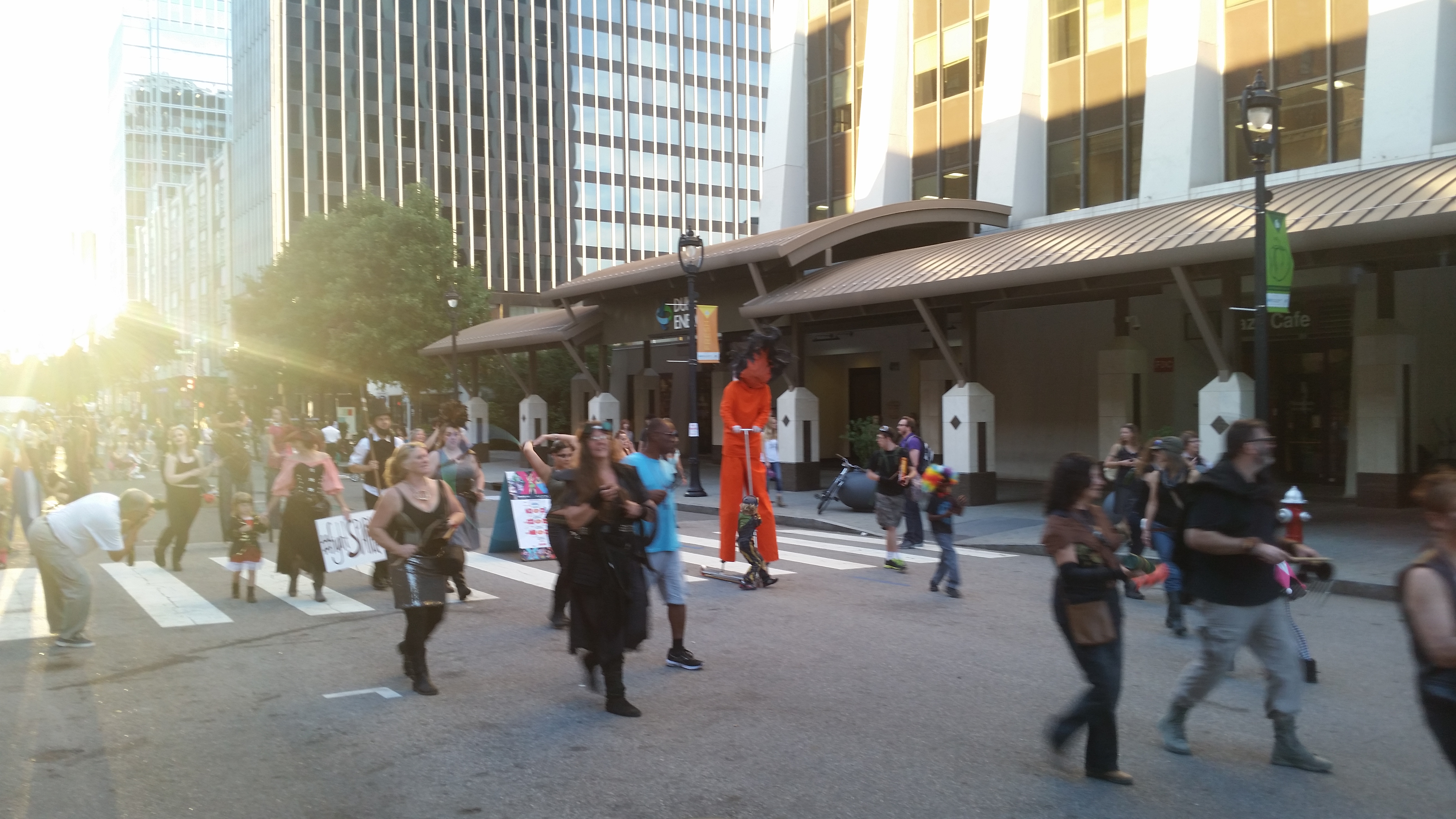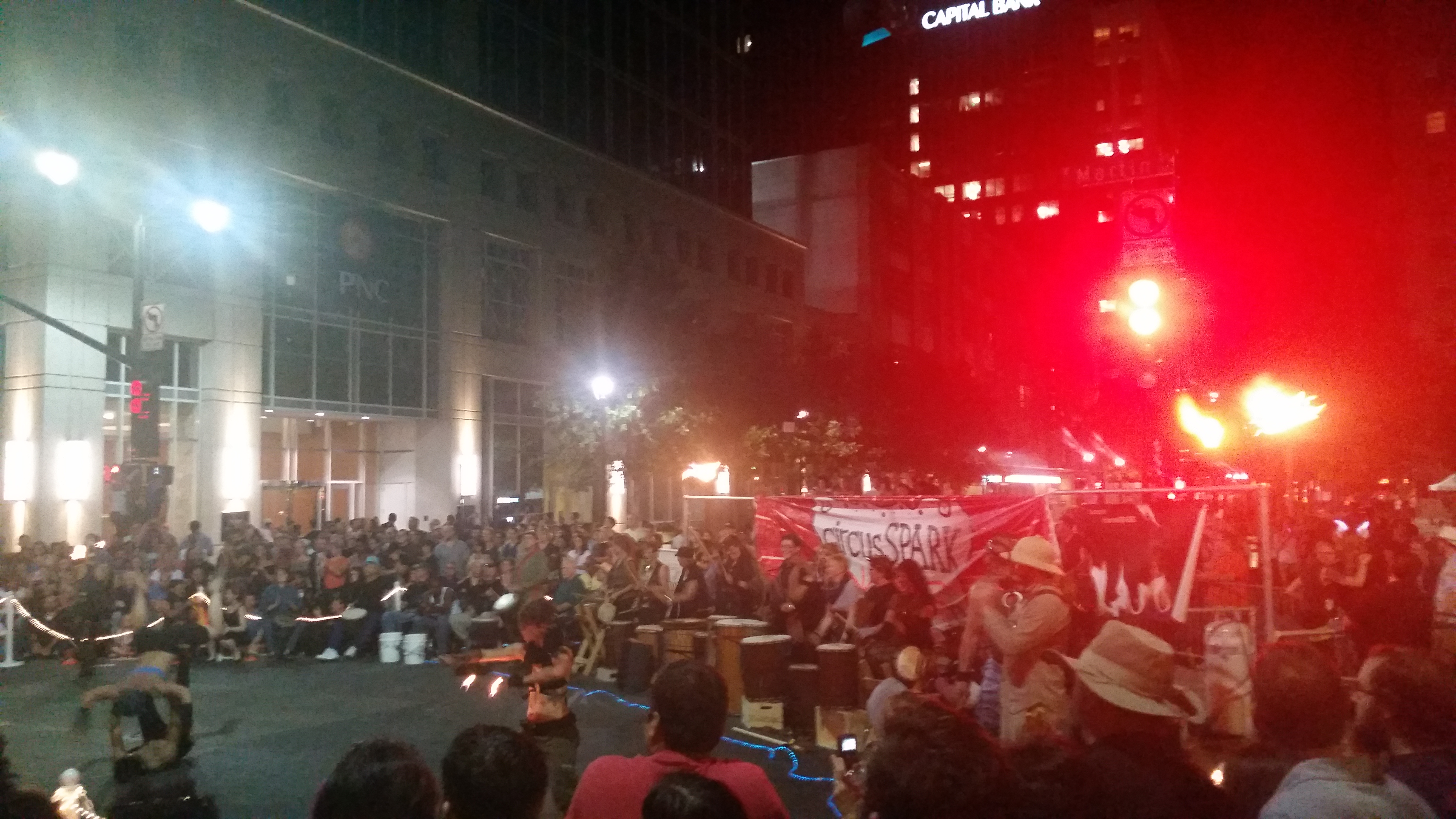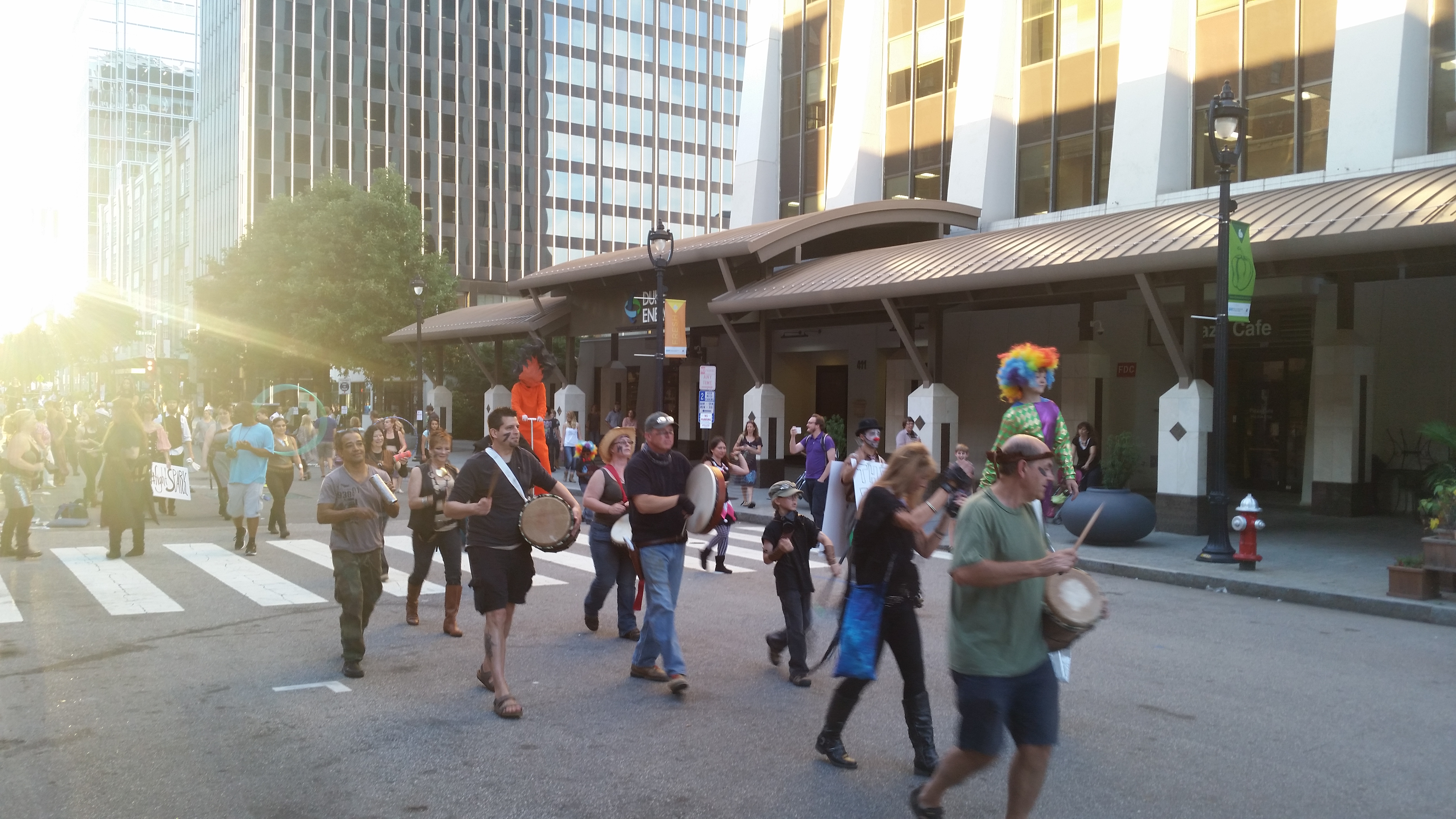 Merri Beth and I took a cruise down Fayetteville Street to see some of the activities. Lots of things were still getting set-up, but the “circus” was in town. We saw some of the circusSPARK performers marching in the circus parade from Martin Street to City Plaza.