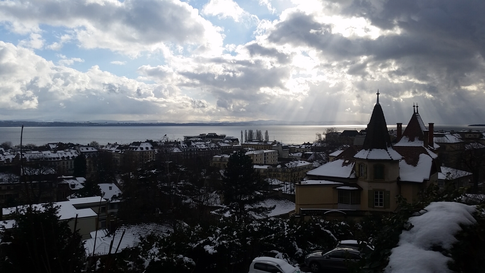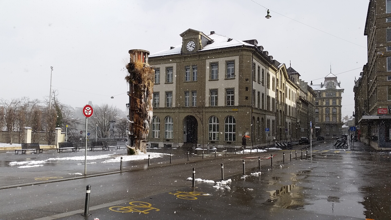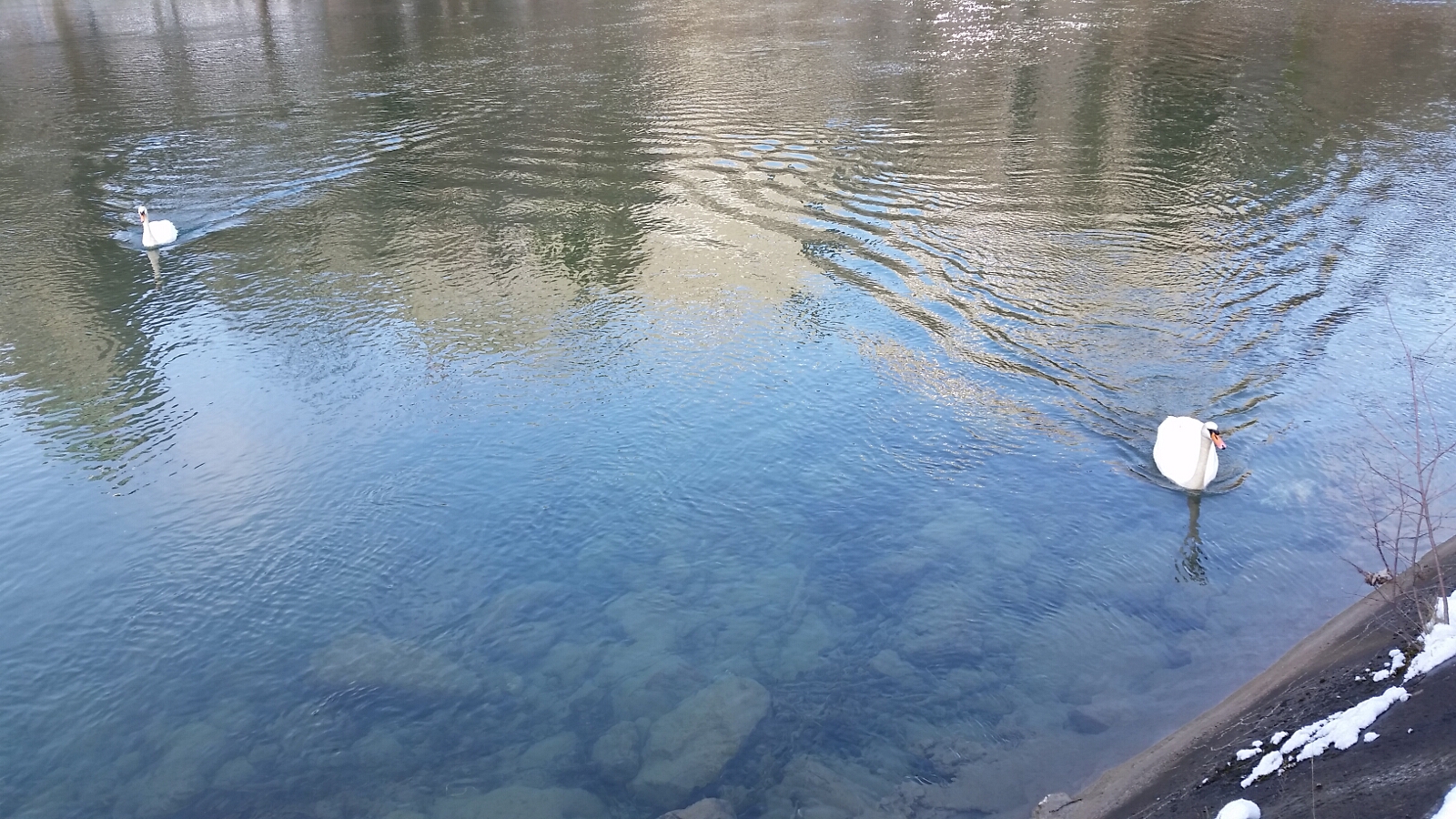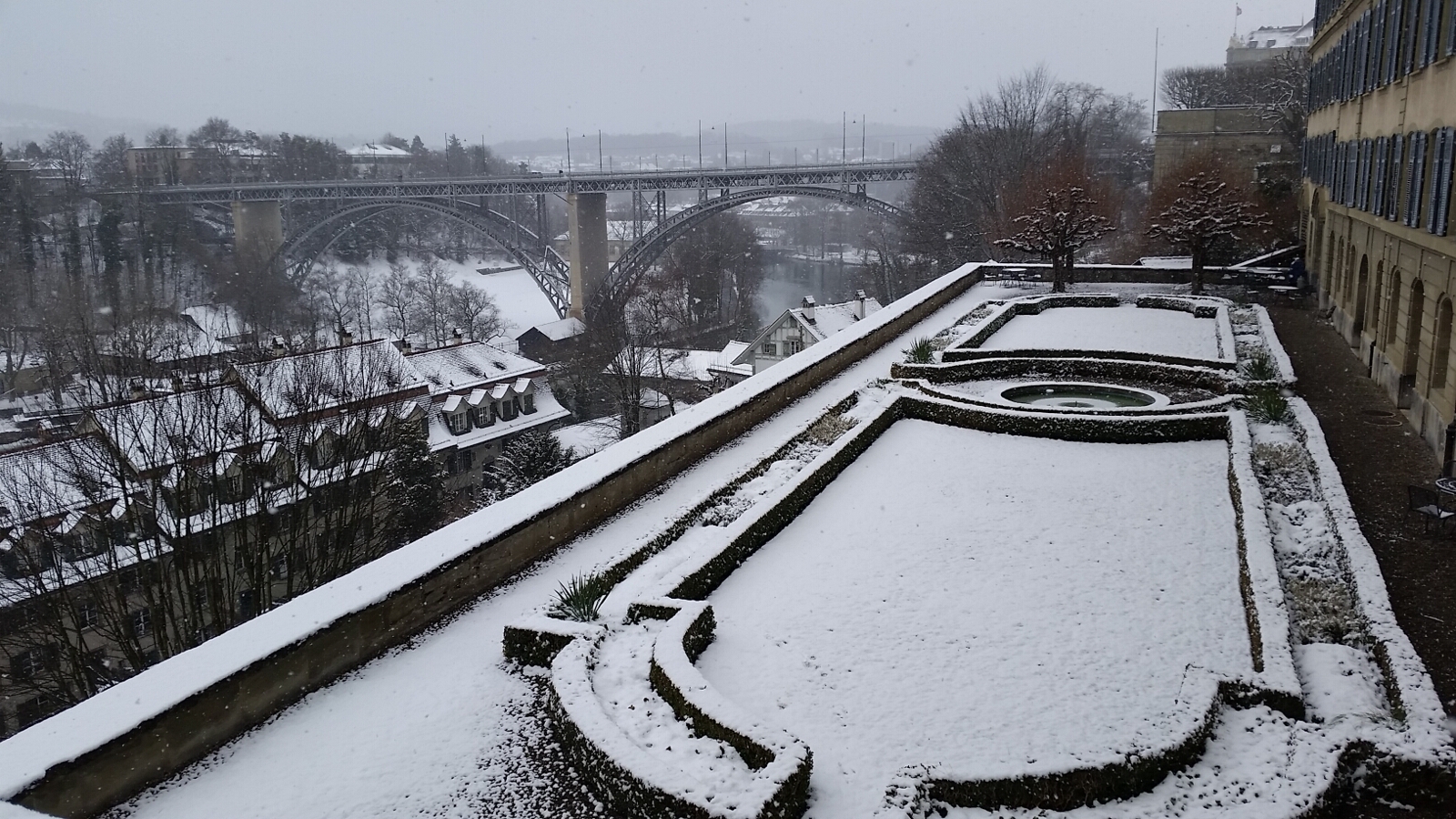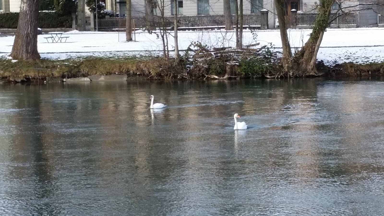 After the bear park, we took a nice walk around the river, through a park, and ended up at the government parliament building near our hotel. Snow would fall periodically and we enjoyed seeing a pair of swans along the river as we went back into the heart of the city. Our day in Bern was expiring and it was time to get on the train headed to Neuchatal.