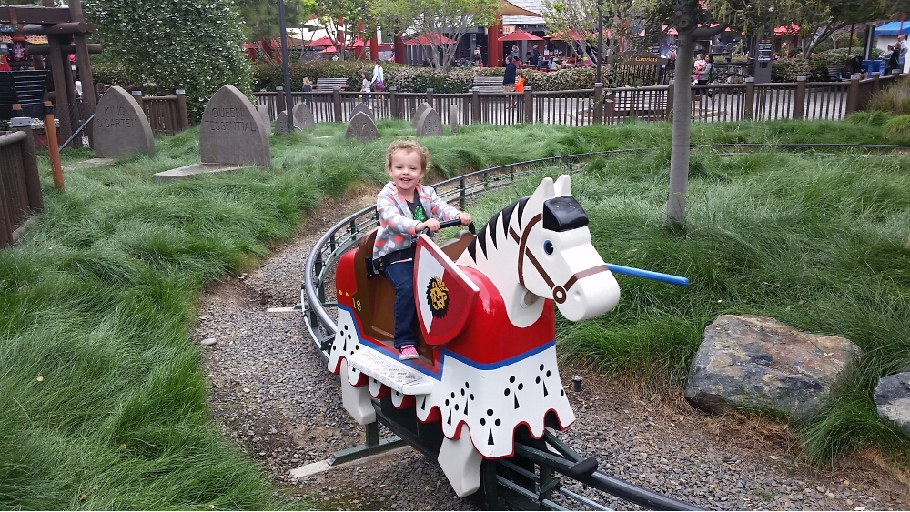 The weather was a bit chilly, and we had our jackets on most of the day because of the cool breeze. It was overcast too, which was probably a blessing in disguise. We grabbed some maps as we went into the park and once we got oriented, headed towards the back of the park. We were in Castle Hill and stood in line for maybe 10 minutes to ride the dragon roller coaster. Coco laughed the entire time, which is so awesome.